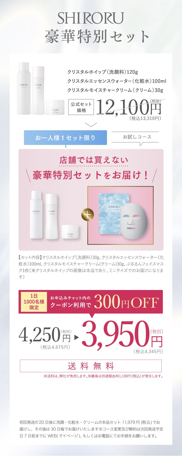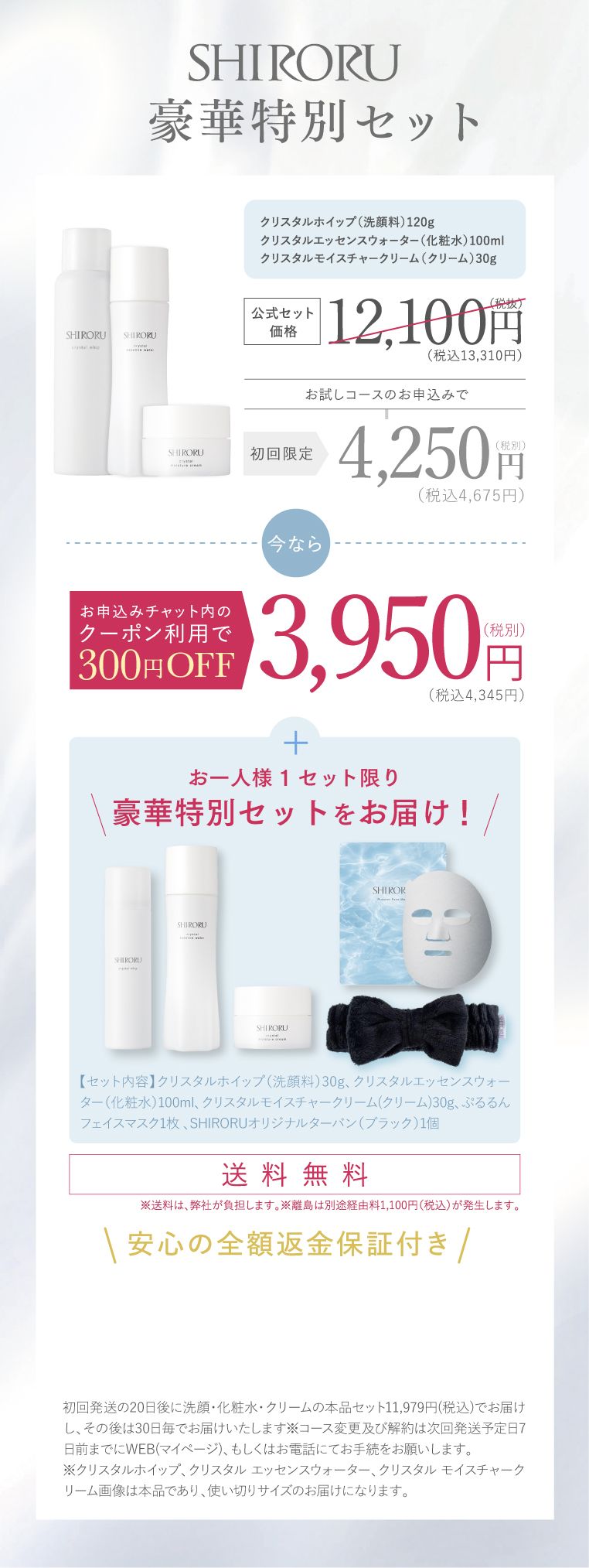 【スキンケアセット】SHIRORUの豪華特別セットが全部もらえる!300円OFFクーポンを受け取る