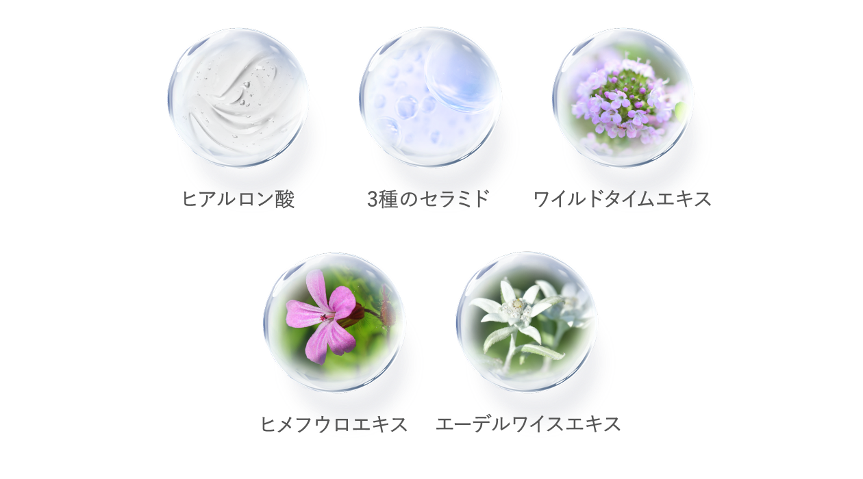 20種類:グリセリン、ヒアルロン酸Na、エーデルワイス花/葉エキス、加水分解コンキオリンタンパク、カミツレ花エキス、ヒメフウロエキス、マンダリンオレンジ果皮エキス、ワイルドタイムエキス、ドクダミエキス、ネオペンタン酸イソデシル、トリイソステアリン、スクワラン、シア脂、オリーブ果実油、ハトムギ油、メドウフォーム種子油、セラミドNP、セラミドNG、セラミドAP、フィトスフィンゴシン