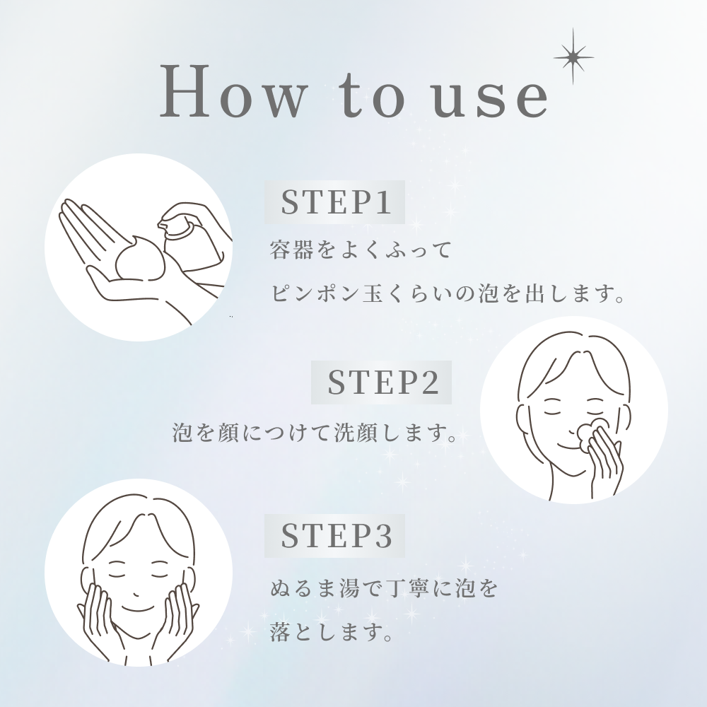 手のひらにピンポン玉程度の泡を取り、指の腹で、20~30秒ほどマッサージしましょう。